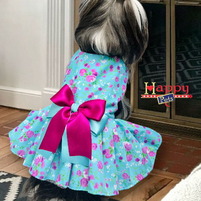 Elegante vestido de Flores con falda en A rotonda y moño violeta grande en la espalda; se ajusta en el pecho por medio de 2 broches con velcro, graduables. Un conjunto de materiales, color y diseño que harán que tu peluda se vea como toda una princesa.