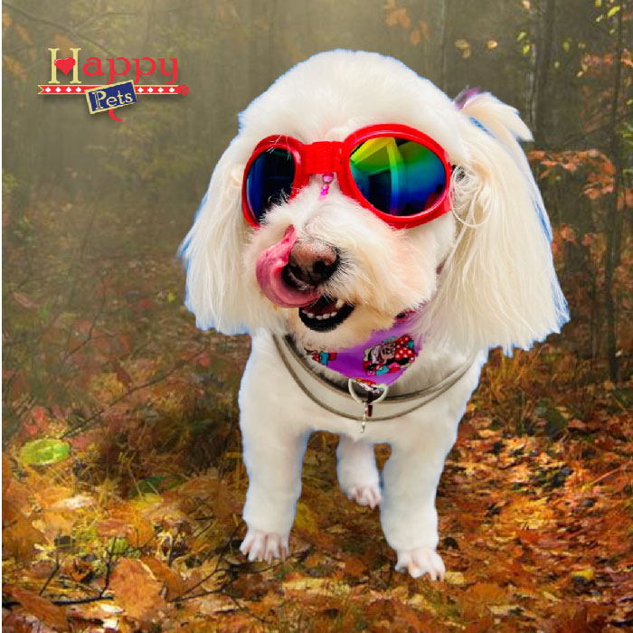 Gafas para peludos medianos y grandes, con protección UV, lente tornasolado, correas elásticas graduables para ajustar alrededor de la cabeza y por debajo del hocico, bordes interiores suaves y acolchonados que reducen la presión sobre los ojos y la cara, marco plegable en el centro para mayor durabilidad y comodidad.