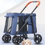 Coche para perros grandes, con puerta y ventana frontal, ventana superior con cremallera para que puedan sacar la cabecita, puerta trasera, 5 espacios en malla para mayor ventilación y visualización, cinturón de seguridad, es plegable para transportarlo en el carro con mayor facilidad; frenos en las ruedas traseras y ruedas delanteras direccionales con giro de 360 grados, material impermeable grueso reforzado. Soporta hasta 60 kilos.