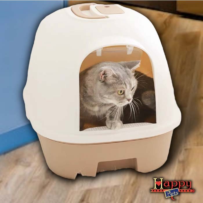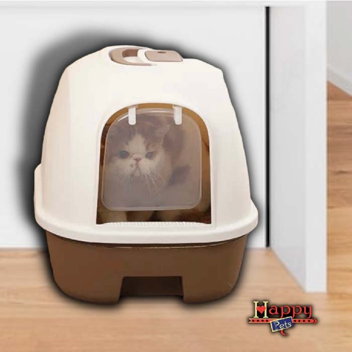 Arenera cubierta, en material plástico de alta resistencia, amplia pero compacta, apta ergonomicamente para la medida promedio de cualquier gato adulto, con las medidas adecuadas para que sea cómoda para ellos pero no ocupe tanto espacio en casa; por su diseño cerrado evita el reguero de arena que se hace cuando el gatito tapa sus necesidades removiendo la arena; tiene una puerta frontal abatible para que el gatito entre y salga y para que se haga la limpieza diaria de la arena, igualmente toda la tapa superior se puede sacar de ser necesario para una limpieza mas profunda. Con filtro de olores en la parte superior; su estructura completamente cerrada evita que los malos olores se diseminen por toda la casa.