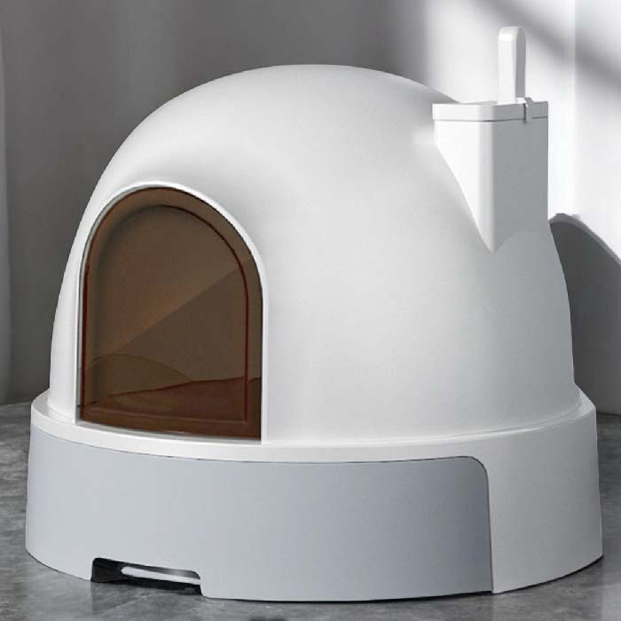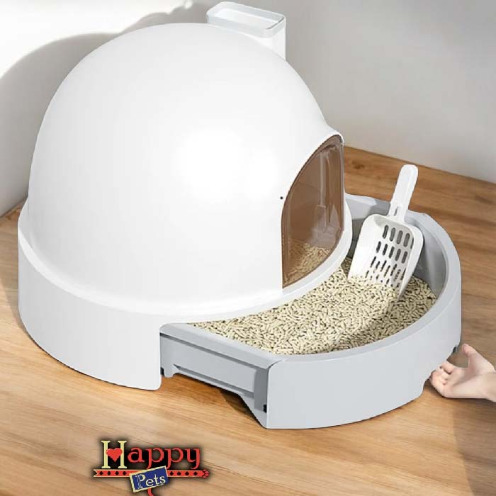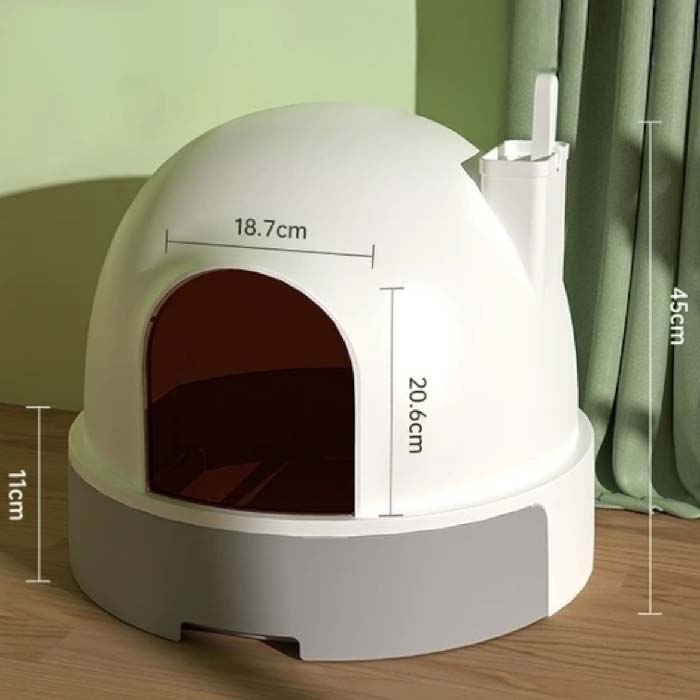Arenera cubierta, en material plástico de alta resistencia, amplia pero compacta, apta ergonómicamente para la medida promedio de cualquier gato adulto, con las medidas adecuadas para que sea cómoda para ellos pero no ocupe tanto espacio en casa; por su diseño cerrado evita el reguero de arena que se hace cuando el gatito tapa sus necesidades removiendo la arena. Además, su amplia base tiene ruedas para que sea mas fácil sacarla para limpiar la arena, sin necesidad de subir la tapa o tener que desarmar toda la arenera; tiene una puerta frontal abatible para que el gatito entre y salga. Su estructura completamente cerrada evita que los malos olores se diseminen por toda la casa.