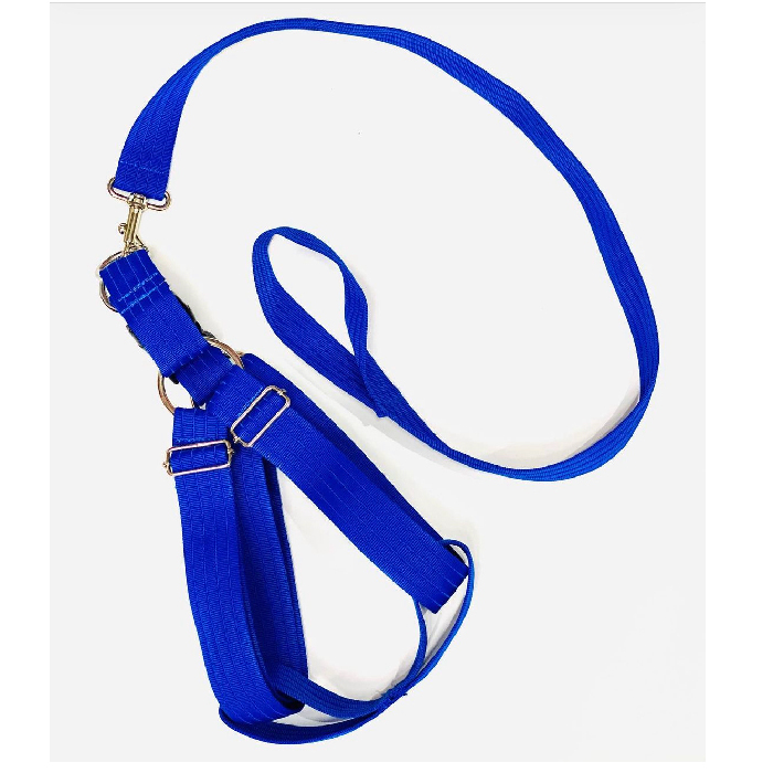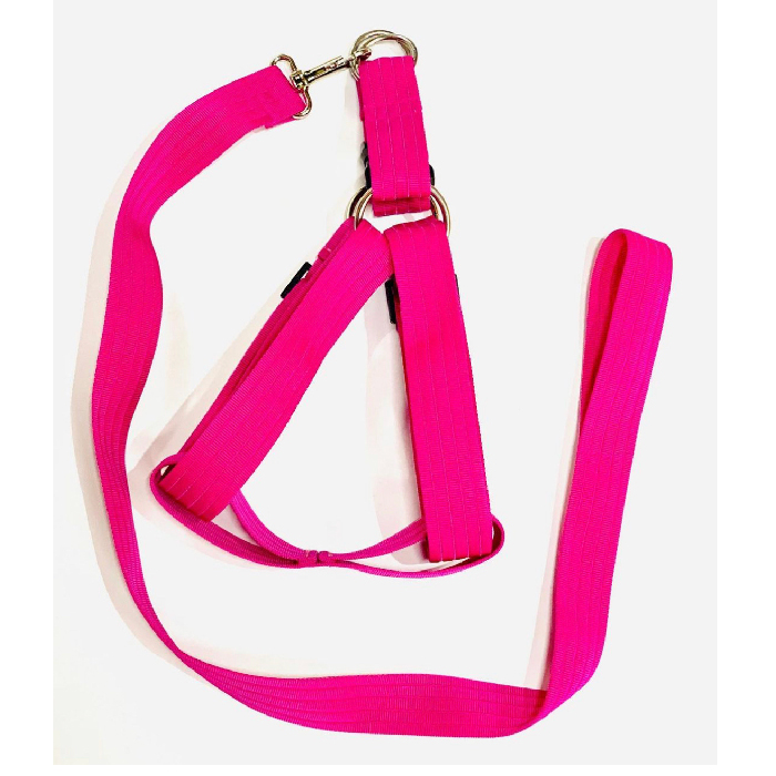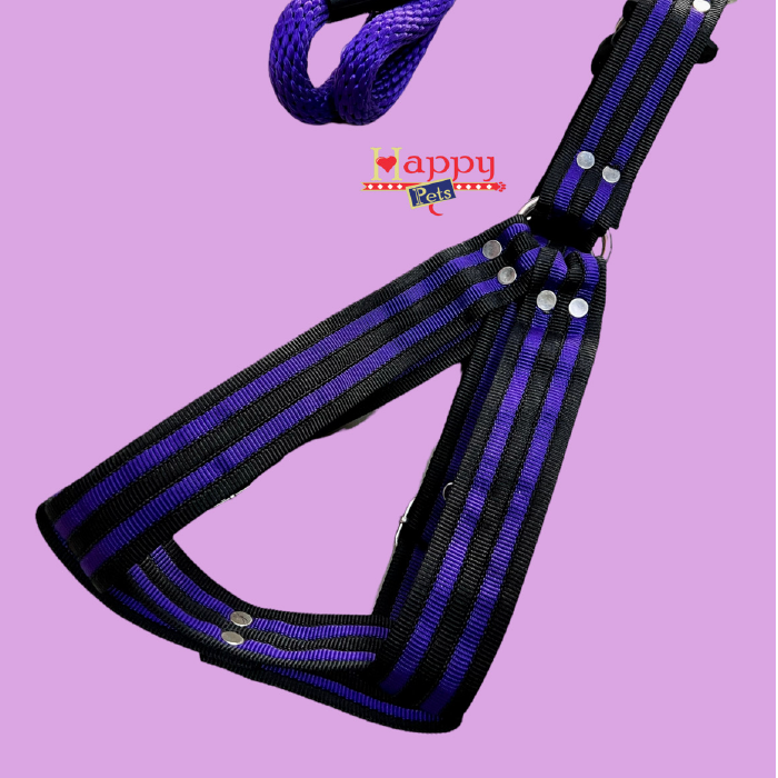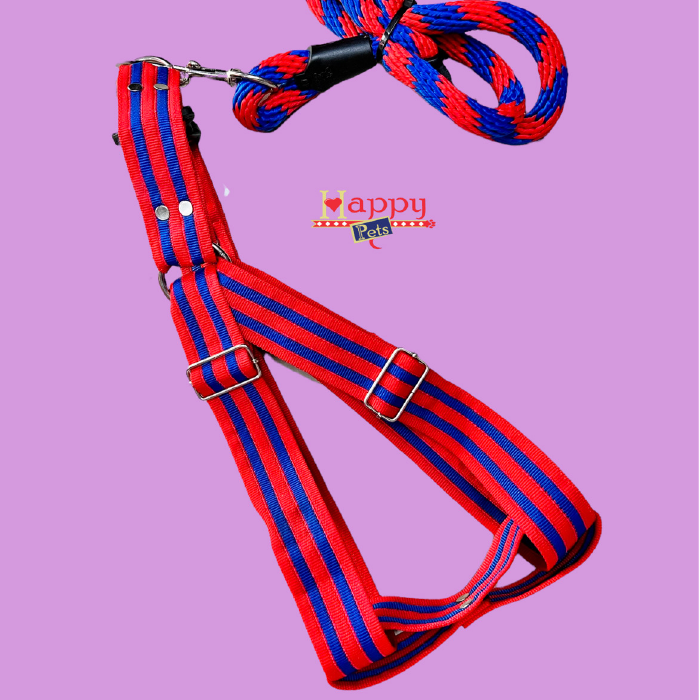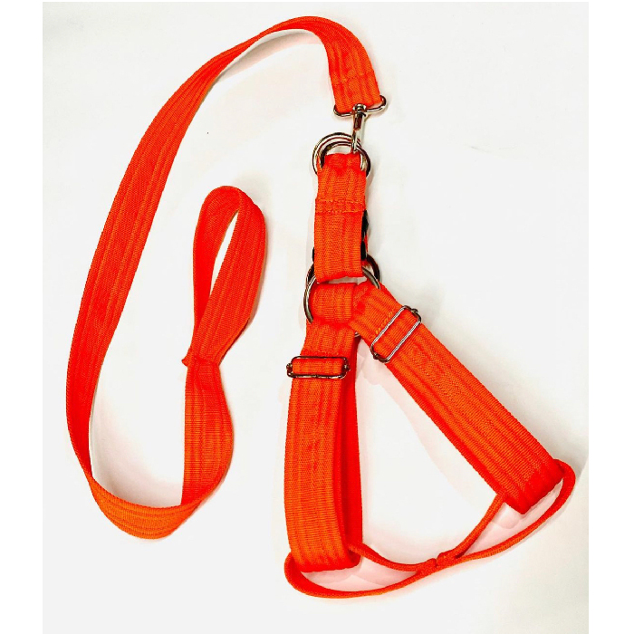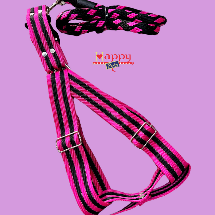 Arnés de tiras gruesas, reforzado, graduable, con herrajes altamente resistentes, que incluye correa; diseñado para mascotas de razas medianas y grandes.
