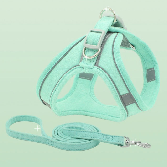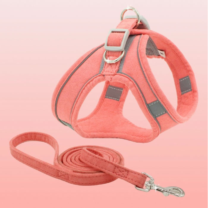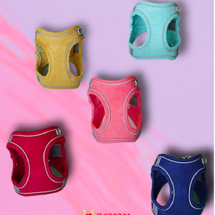 Arnés pechera en material de gamuzado y acolchonado suave, con franjas reflectivas, bordes suaves y doble cierre con velcro y cierre plástico para mayor seguridad; 2 aros gruesos para la sujeción de la correa, e incluye la correa. Super cómodo, suave, seguro y ligero. La mezcla perfecta entre elegancia y confort.