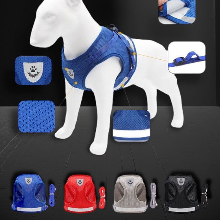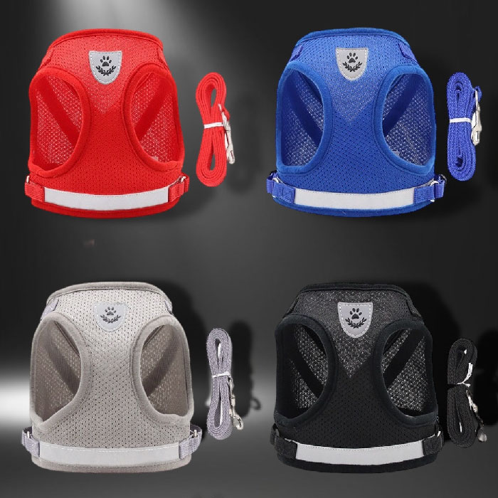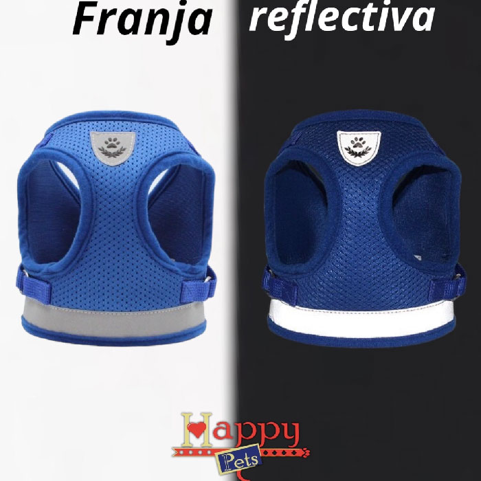 Arnés pechera en material de malla transpirable, con franja gruesa reflectiva en el pecho y triple cierre, en velcro, con broche y aros metálicos, para mayor seguridad; super cómodo, suave y seguro. La mezcla perfecta entre un look deportivo, casual, eficiente y confortable.