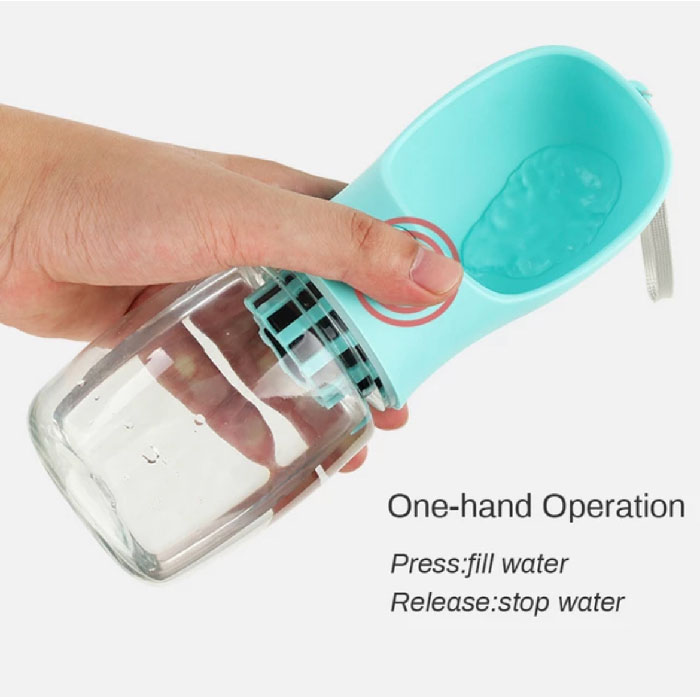 Botilito automático, para llevar el agua de tu peludo a todas partes y poder servirle en el mismo platico que viene adjunto. Al oprimir el botón deja pasar el agua para llenar el plato y al soltarlo detiene el flujo, para poder darle de beber al perro, al terminar de beber se puede oprimir de nuevo el botón y el agua ingresara nuevamente al interior de la botella para evitar desperdiciar el agua. El botón bloquea o permite el paso del agua. Incluye una perilla lateral que bloquea el botón o lo libera para evitar que se oprima sin querer y pueda derramarse agua dentro de tu maleta. Compacto y fácil de llevar sin que ocupe mucho espacio.