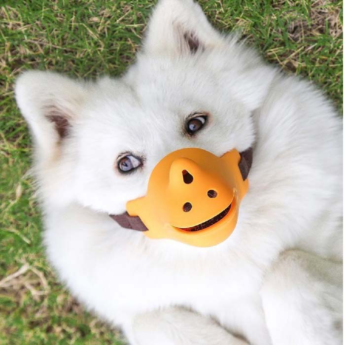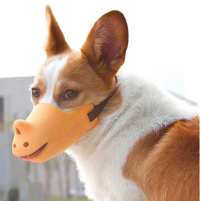 Bozal de rinoceronte para perros de razas pequeñas y medianas, en material plástico siliconado, suave al tacto, muy resistente y biodegradable; que les permite respirar con total libertad, abrir un poquito la boca, pero no les permite morder, ni comer cosas de la calle. Con correa graduable para ajustar detrás de la nuca y orejas. Un bozal lindo, cómodo y divertido para peludos con personalidad arrolladora.