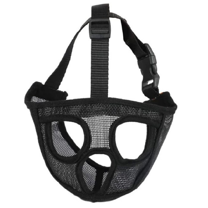 Bozal en malla respirable, para perritos chatos, disponible en talla S, M y L, en material suave y transpirable, con bordes reforzados; graduable con correas en la cabeza y cuello. Que les permite respirar con total libertad y abrir su boca si quieren jadear, pero no les permite ni morder a otros, ni comer cosas de la calle. Un bozal cómodo, liviano y fresco.