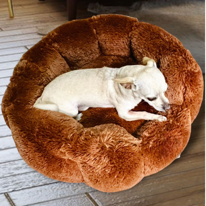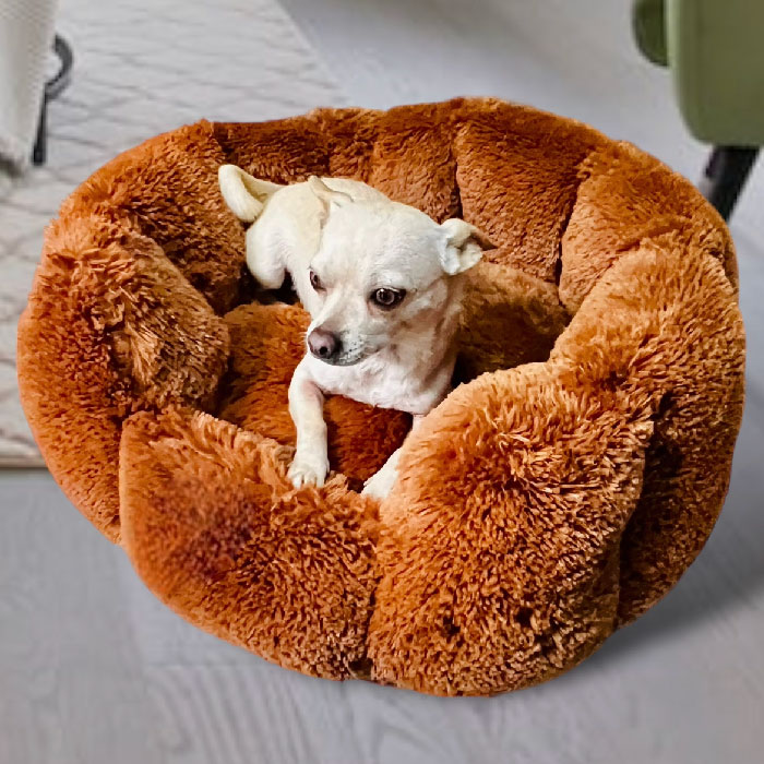 Cama redonda super abullonadita, en peluche suave y calientico, con paredes altas para proteger al peludo del frio y para que puedan recostar su cabecita más cómodamente.