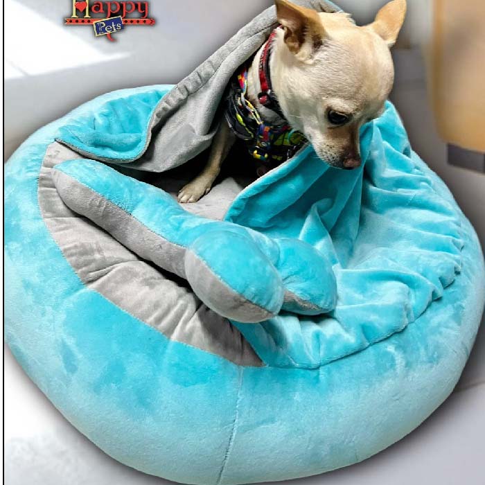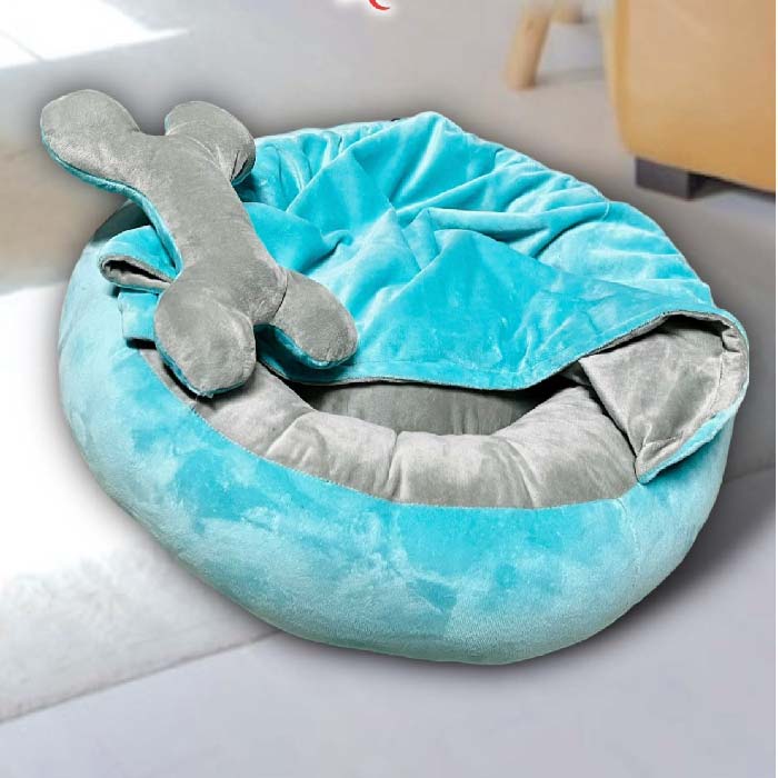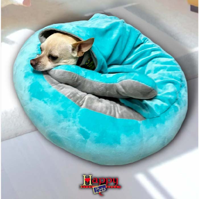 Cama redonda en forma de Dona con cobijita doble faz anexa en la parte superior, formando un sleeping, donde las mascotas se pueden meter para protegerse del frio; incluye cojín en forma de huesito. Es super abullonadita, en peluche suave y calientica; una de las camas más cómodas y cálidas, para que tu peludo duerma plácidamente. Fácil de lavar en lavadora.