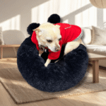 Cama redonda en forma de Dona con cobijita doble faz anexa en la parte superior, formando un sleeping, donde las mascotas se pueden meter para protegerse del frio; incluye cojín en forma de huesito. Es super abullonadita, en peluche suave y calientica; una de las camas más cómodas y cálidas, para que tu peludo duerma plácidamente. Fácil de lavar en lavadora.