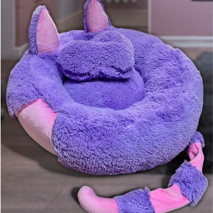 Cama redonda en forma de Dona con orejitas y cola de gatito, super abullonadita, en peluche suave y calientica, con cojín en forma de corazón; una de las camas más cómodas y cálidas, para que tu peludo duerma plácidamente. Fácil de lavar en lavadora.