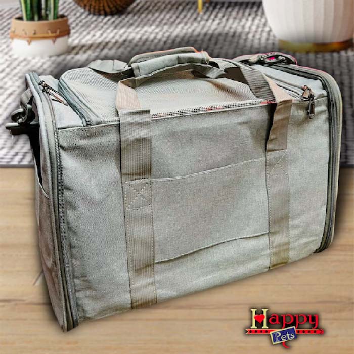 Cargador en Lona impermeable de alta resistencia, con costuras reforzadas, 3 ventanas en malla con cremallera, bolsillo, asas cortas y largas, cinturón de seguridad, base semirígida, acolchonada y en material térmico ovejero para mayor estabilidad y confort, soporte trasero para asegurar el cargador a la maleta de viaje o a la silla del carro; apto para cabina de avión.