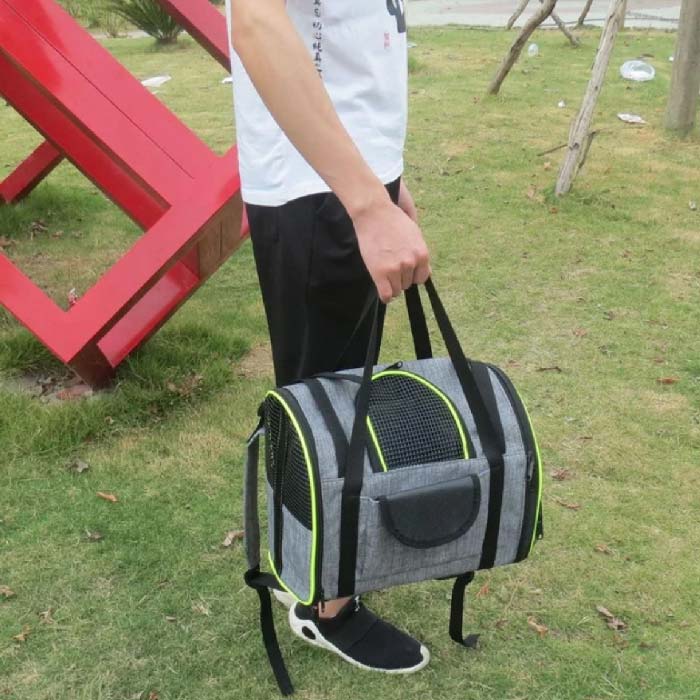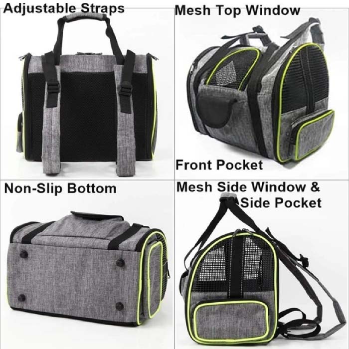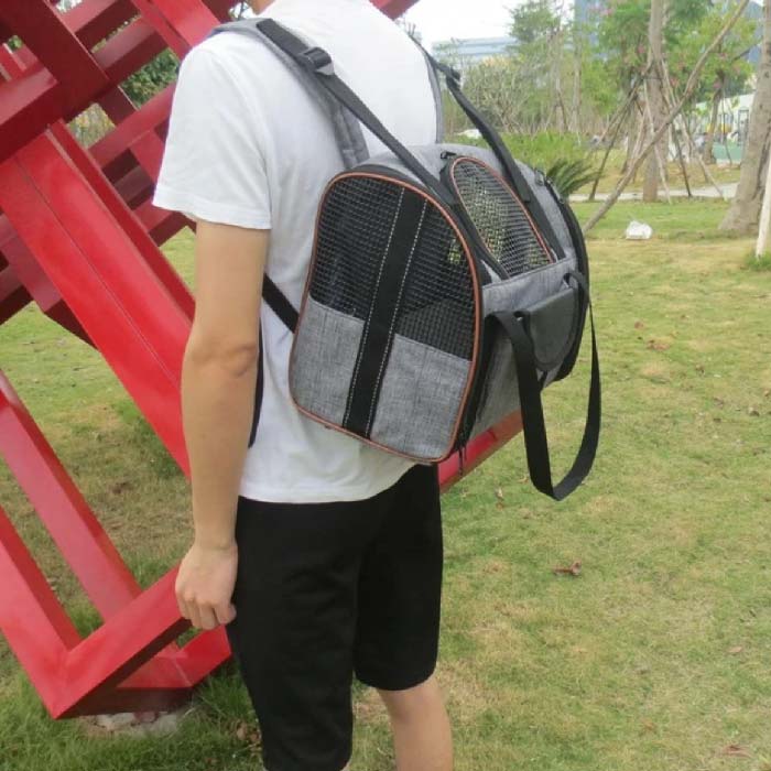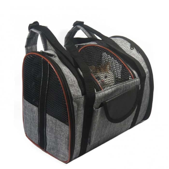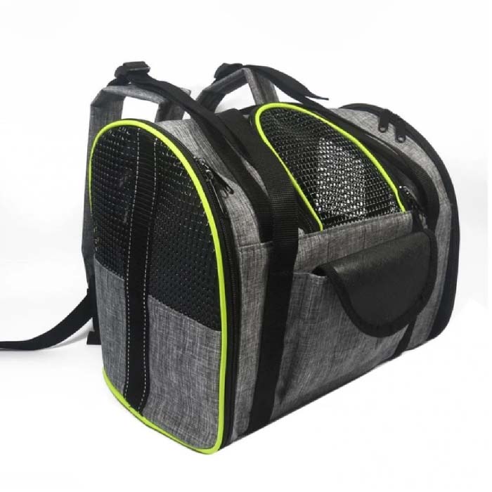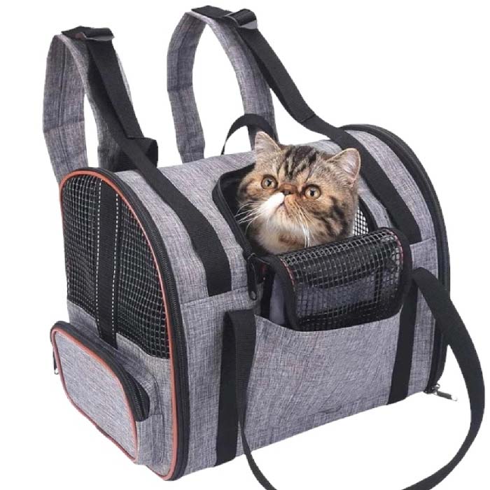 Morral para gatos o perros pequeños, compacto, ligero, que se puede llevar en el pecho o la espalda, con ventana frontal en malla con cremallera, entradas laterales, bolsillos frontal y lateral, mallas laterales para mayor ventilación y cinturón de seguridad interno. Material Lona gruesa impermeable, espaldar y asas acolchonadas para mayor comodidad y base semirrigida para mayor estabilidad y estructura. Ideal para viajes en moto o bicicleta. Soporta hasta 10 kilos. Apto para cabina de avión.