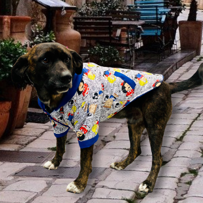 Chaqueta impermeable y térmica de Mafalda, acolchada, con cremallera y gorrita, ideal para días fríos y lluviosos y también para peludos a los que les gusta marcar la diferencia. Con diseño ergonómico, que no permite que ensucien su ropita a la hora de ir al baño.