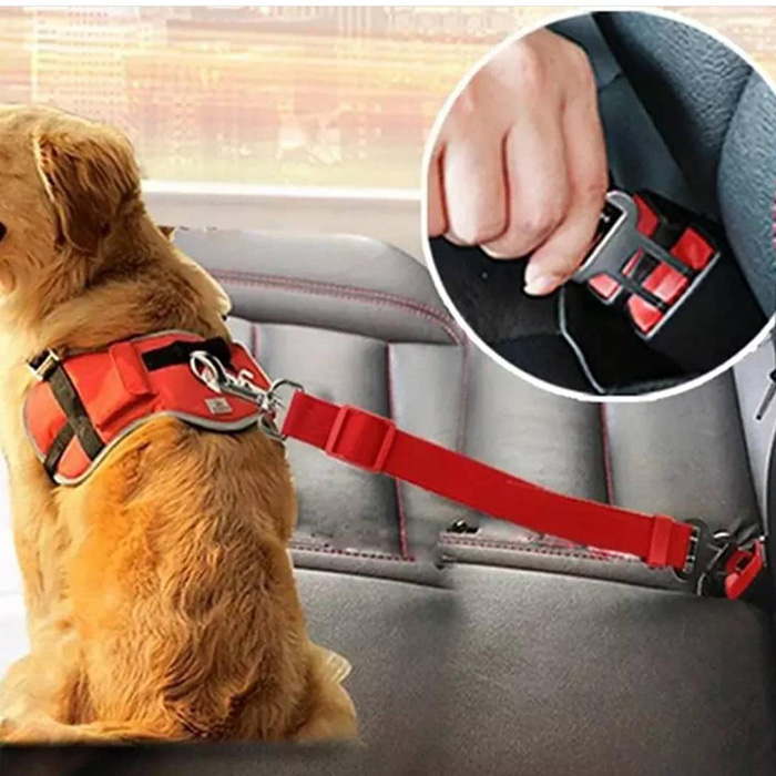 Cinturón de seguridad para que la mascota pueda ir sujeta a la silla del carro, que en un extremo tiene un herraje universal que entra en cualquier cinturón de seguridad y en el otro extremo un herraje metálico que se sujeta al arnes del peludo, para mantenerlo en un solo espacio del carro y evitar que salga volando si se frena o hay un movimiento fuerte; le permite la movilidad suficiente para sentarse o acostarse ya que es graduable, apto para peludos de todos los tamaños. Fabricado en Nylon de alta resistencia con herrajes metálicos.