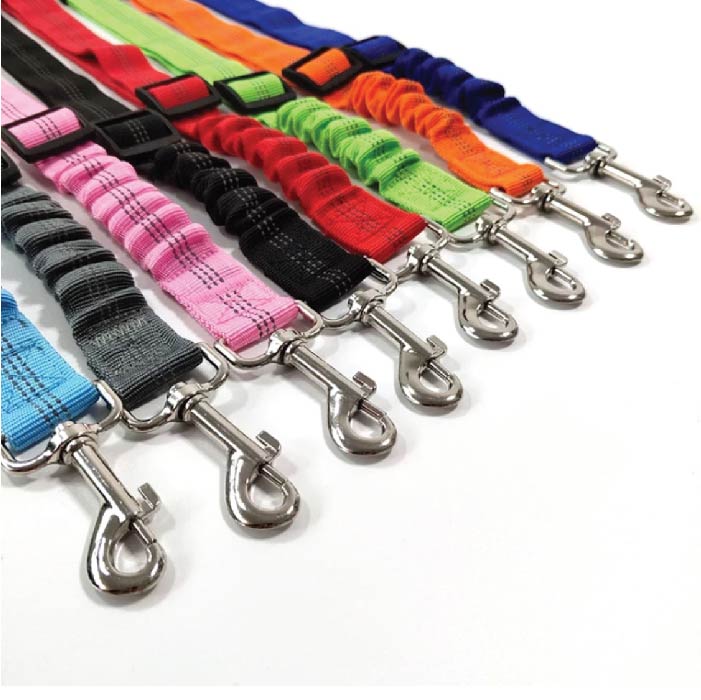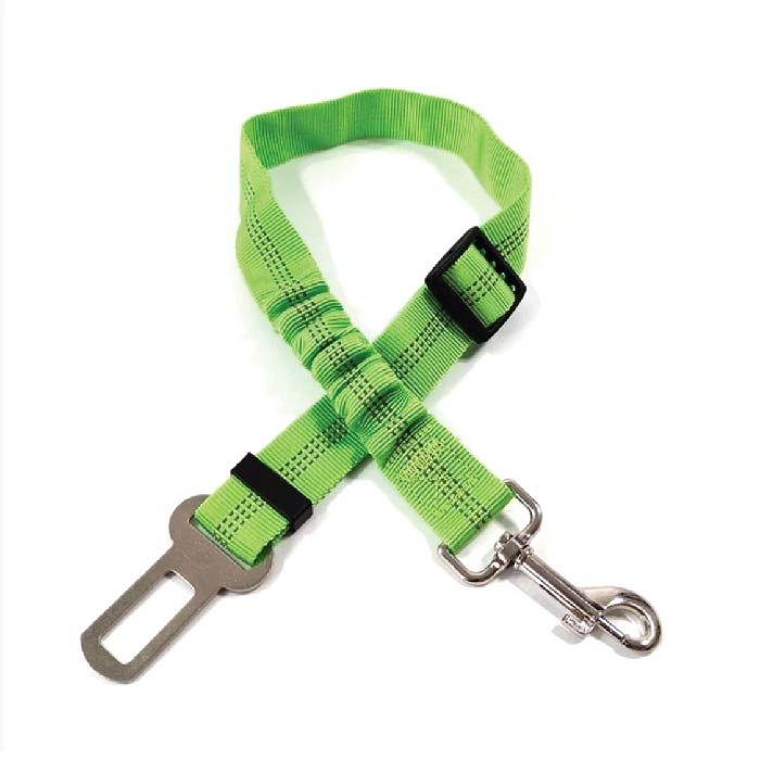 Cinturón de seguridad para que la mascota pueda ir sujeta a la silla del carro, que en un extremo tiene un herraje universal que entra en cualquier cinturón de seguridad y en el otro extremo un herraje metálico que se sujeta al arnes del peludo, para mantenerlo en un solo espacio del carro y evitar que salga volando si se frena o hay un movimiento fuerte; le permite la movilidad suficiente para sentarse o acostarse ya que es graduable y tiene una parte resortada que ayuda a amortiguar en caso de choque, apto para peludos de todos los tamaños. Fabricado en Nylon de alta resistencia con herrajes metálicos.