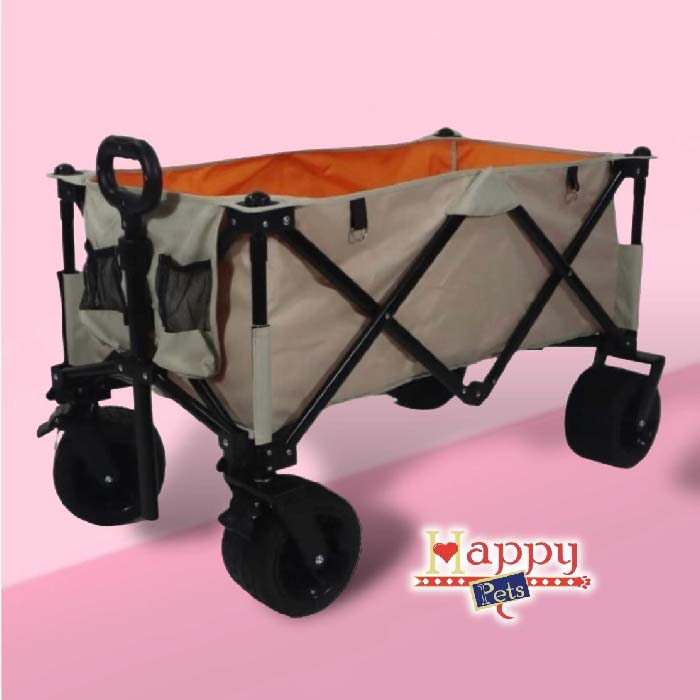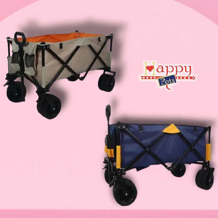 Coche para perros medianos y grandes, a manera de carretilla, con la parte superior completamente abierta, 2 bolsillos en la parte delantera, almohadilla interna impermeable, es plegable para transportarlo en el carro con mayor facilidad, con frenos en las ruedas traseras y ruedas delanteras direccionales con giro de 360 grados, manubrio graduable y material impermeable grueso reforzado. Soporta hasta 80 kilos.