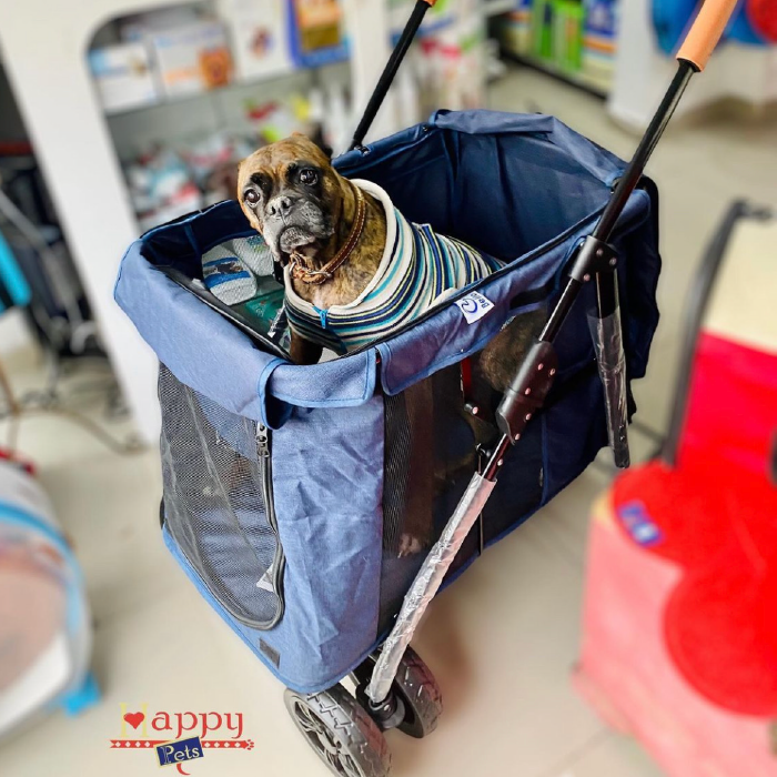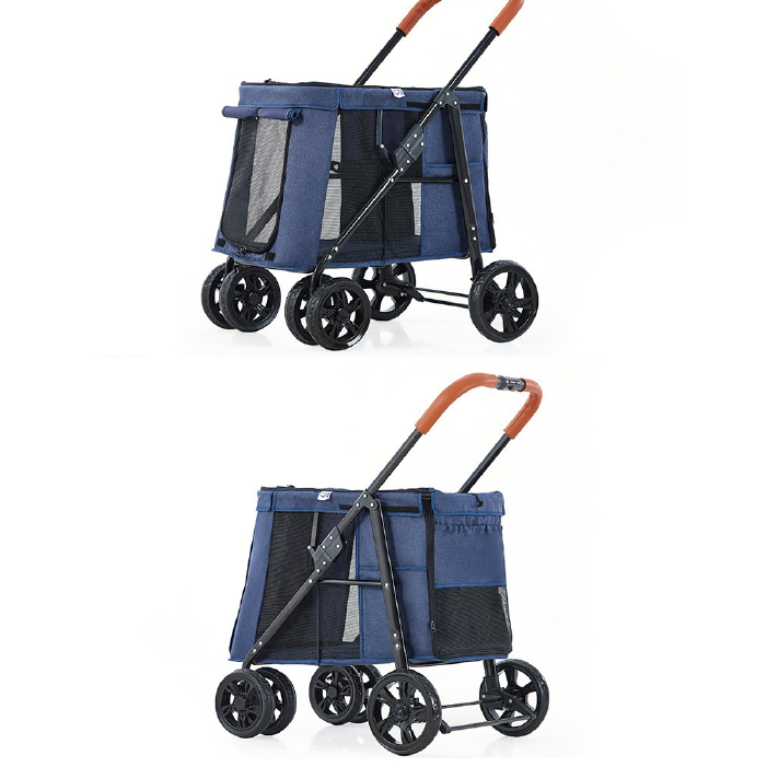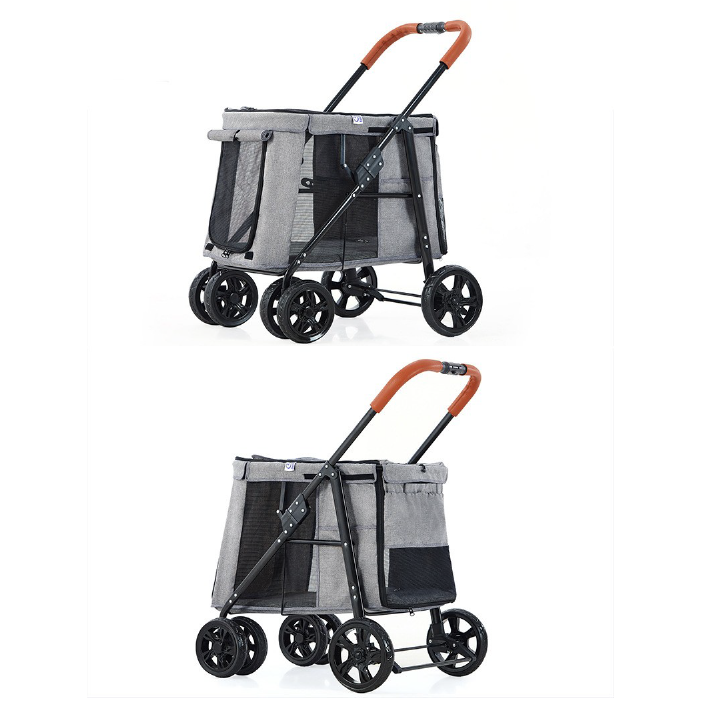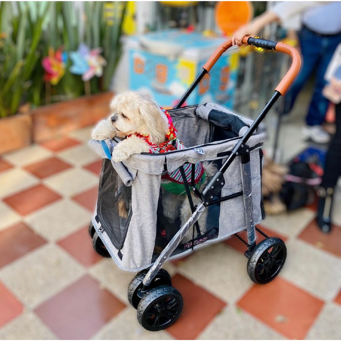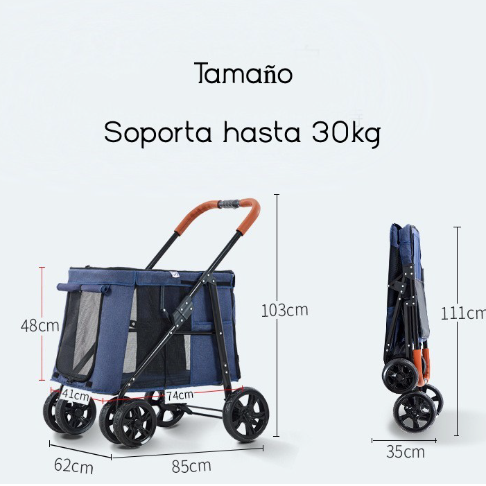 Coche para perros medianos y grandes, con puerta frontal en malla con cubre puerta, puerta y ventana superior en malla con cubrepuerta, puerta trasera en malla con 2 bolsillos, laterales en malla con bolsillos, plataforma superior para llevar el bolso u otros accesorios,2 cinturones de seguridad, base rígida acolchonada con forro en Lona impermeable fácil de lavar, es plegable para transportarlo en el carro con mayor facilidad, tiene frenos en las ruedas traseras y ruedas delanteras direccionales con giro de 360 grados y material general impermeable grueso reforzado. Soporta hasta 30 kilos .