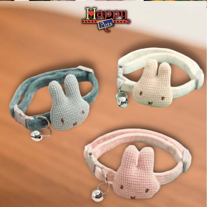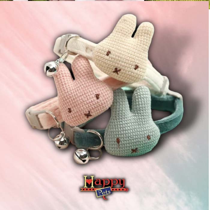Collar para gatitos o perros pequeños, con reata suave y aplique de carita de conejo abullonadita, cierre plástico y aro para colgar la placa.