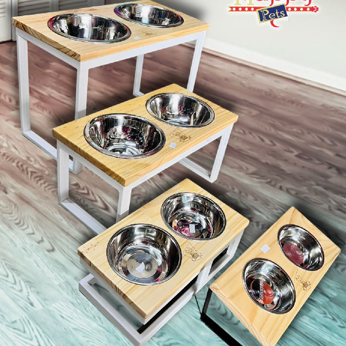 Comedero doble elevado, con base inferior metálica con topes antideslizantes, base superior en madera y platos en Acero Inoxidable; Muy duradero, resistente, de alta calidad y fácil de lavar; apto para gatos y perros de todos los tamaños, para uso en interiores o exteriores. Al estar elevado les facilita el acceso al agua y la comida en una posición más cómoda para su columna, reduciendo el estrés postural y ayudando a una mejor digestión.