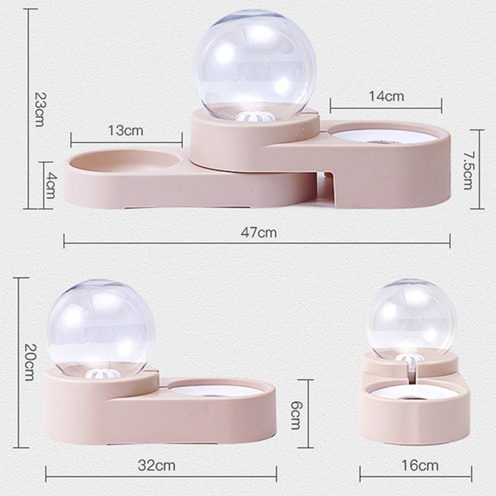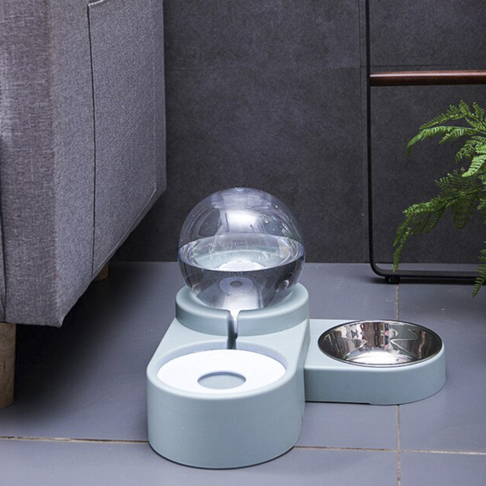Comedero doble con dispensador de agua en forma de burbuja, con tanque de almacenamiento acrílico transparente esférico,  del que va bajando el contenido por gravedad a medida que el peludo va bebiendo y el plato se va llenando solo, tiene una tapa en la parte inferior de la esfera para introducir fácilmente el agua; plato en Acero Inoxidable para el agua y plato para el agua con tapa antireguero para que no desperdicien agua y no se unten los bigotes. Es muy práctico y fácil de usar, ideal para quienes no pueden estar en casa para servir el agua sus mascotas. Se puede desarmar totalmente para lavarlo. Apto para gatos y perros pequeños y medianos.