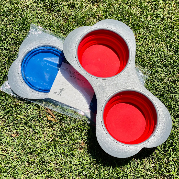 Comedero doble con platos plegables, portátil, fácil de guardar y llevar a todas partes, ideal para viajes; en material plástico y silicona, libre de BPA. Disponible en color rojo y azul, sujeto a disponibilidad en la tienda.