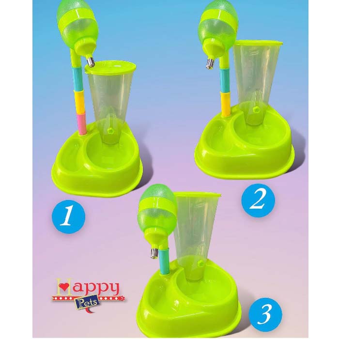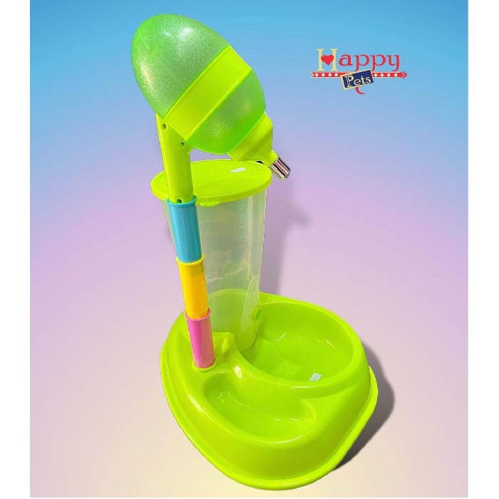 Comedero doble, con bebedero alto en Roll on para que los peludos beban de allí el agua sin mojarse las barbitas ni hacer reguero y dispensador de comida con capacidad de 2.400 ml; la altura del bebedero se puede graduar, en la base tiene un plato para la comida y otro para agua por si caen goticas del bebedero; En material plástico resistente, desarmable para lavar fácilmente y topes antideslizantes para que no lo muevan con facilidad; apto para gatos y perros pequeños y medianitos.