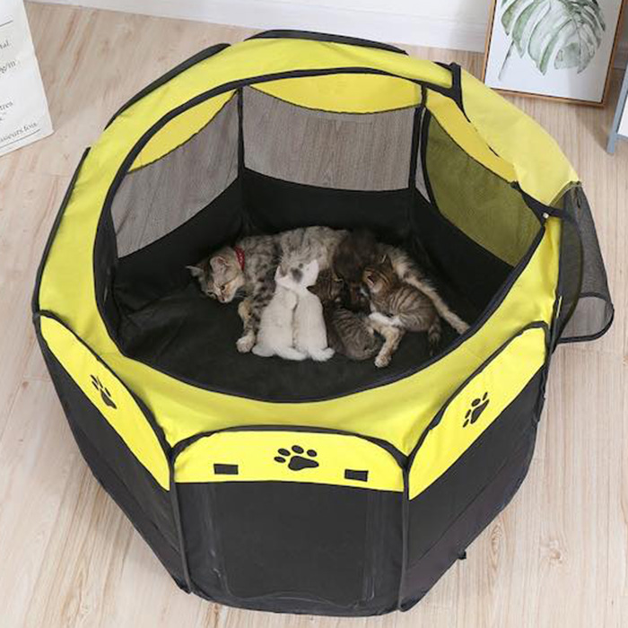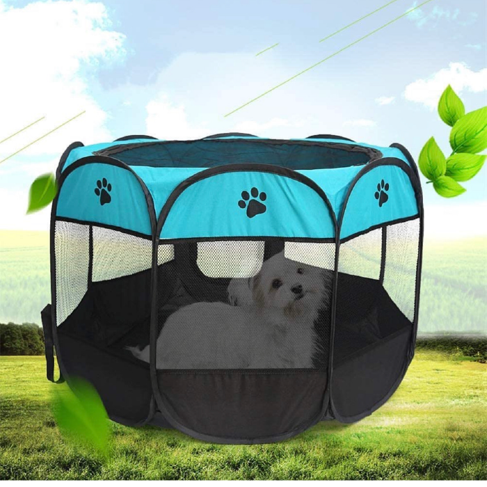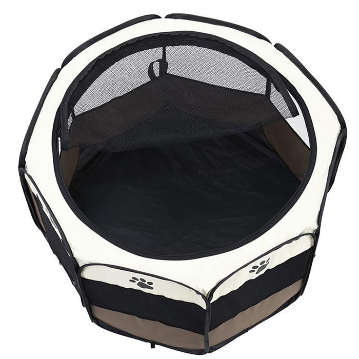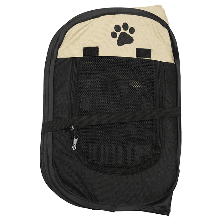 Corral plegable, que se arma en segundos sin necesidad de ningún ensamblaje, para guardar simplemente se dobla y queda plano; con diseño de 8 paneles con costuras y esquinas reforzadas, material en Lona impermeable gruesa de alta resistencia, puerta con cremallera en uno de los paneles laterales y tapa superior con cremallera para uso en interiores o al aire libre. Plegable, portátil y ligero para un fácil almacenaje. Ideal para mantener a tu peludo seguro en un ambiente controlado cerrado, donde pueda tener su camita, juguetes y demás pertenencias para pasar un buen momento en un espacio seguro. Excelente para mantener controlados a cachorritos o para que un peludo que necesite guardar reposo, se este quieto en un solo lugar. Disponible solo en tamaño pequeño.