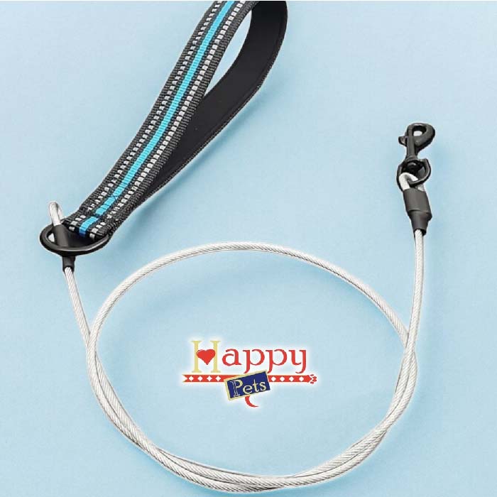 Correa de Acero con recubrimiento plástico, de alta densidad muy resistente, suave al tacto, con mango en reata reflectiva acolchonada, para mayor comodidad y herrajes en Acero Inoxidable, muy seguro y de alta resistencia, con gancho que gira 360 grados para permitir mayor libertad de movimiento. Ideales para peludos pequeños y medianos, mordelones que suelen morder su correa y dañarla.