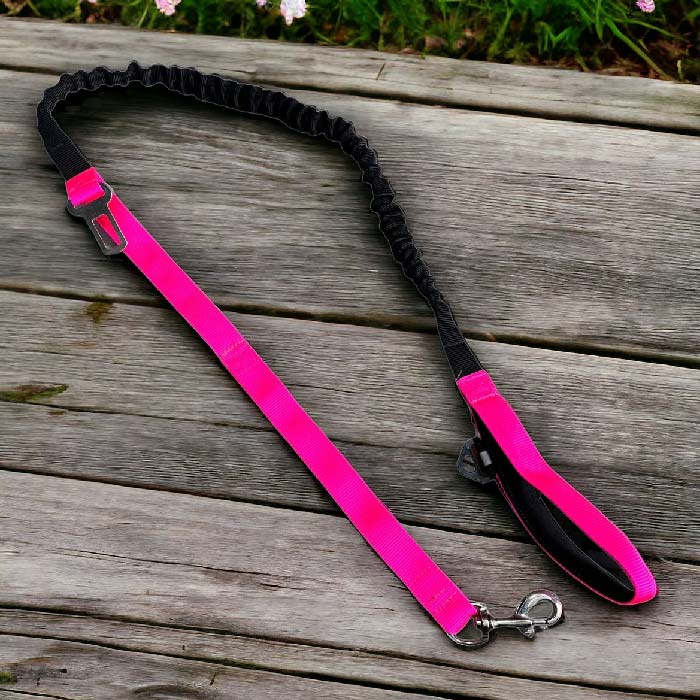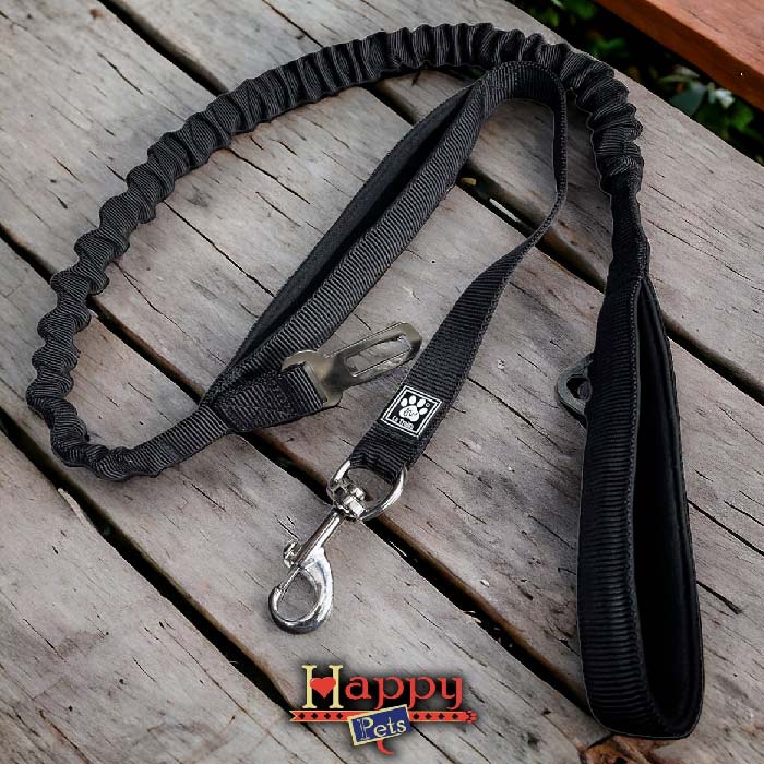 Correa y/o traílla resortada doble función, que sirve como correa para sacar el perro a pasear o como cinturón de seguridad para el carro; con mosquetón altamente resistente, doble manija de agarre con interior suave acolchonado para mayor comodidad y accesorio para porta bolsas.