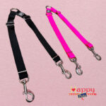 Correa y/o traílla resortada doble función, que sirve como correa para sacar el perro a pasear o como cinturón de seguridad para el carro; con mosquetón altamente resistente, doble manija de agarre con interior suave acolchonado para mayor comodidad y accesorio para porta bolsas.