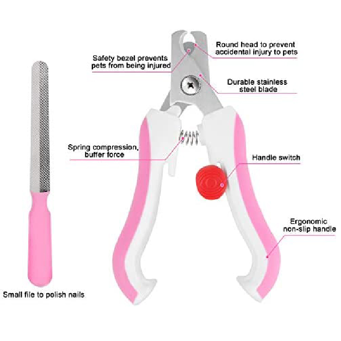 Cortaúñas diseñado especialmente para uso doméstico con mascotas, en Acero quirúrgico, muy fácil, seguro e intuitivo de usar, ergonómico, con mango de plástico y goma para un mejor agarre, resistencia al deslizamiento y ahorro de esfuerzo; incluye una lima metálica.