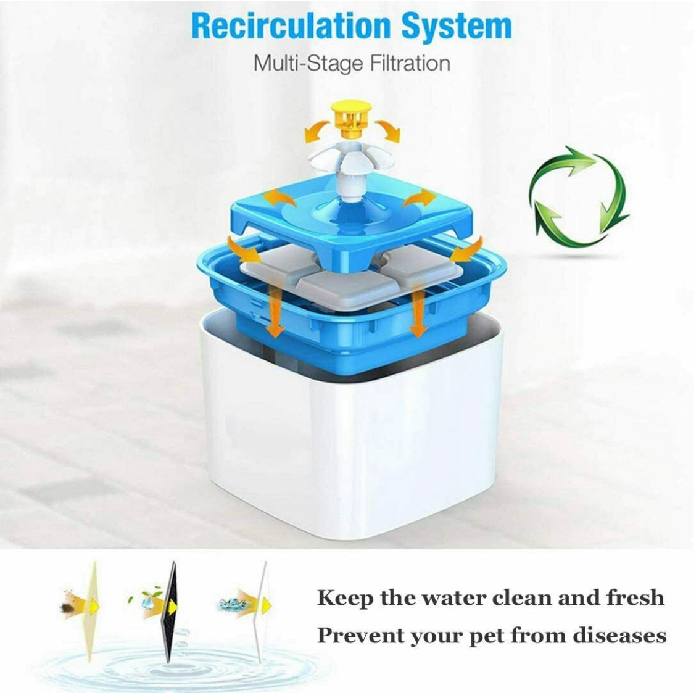 Fuente de agua cuadrada, apta para gatos y perros de todos los tamaños, ideal para mantener el agua en constante flujo, más limpia, oxigenada y con buen sabor, para que los peludos beban con mas constancia y se mantengan sanos. Con filtro de carbono intercambiable, motor que funciona bajo el agua, 3 tipos de flujo del agua y para su funcionamiento se conecta a la electricidad por medio de un cable USB. Libre de BPA. De alta calidad, durable y silenciosa. No incluye tapete.