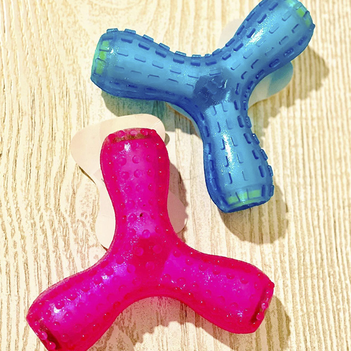 Juguete de 3 puntas, flexible siliconado, transparente, con texturas y sonido en su interior que se activa con movimientos fuertes; para peludos juguetones y mordelones de todos los tamaños; por su textura ayuda también a limpiar los dientes y fortalece sus mandíbulas. Material liviano, altamente resistente, fácil de limpiar.