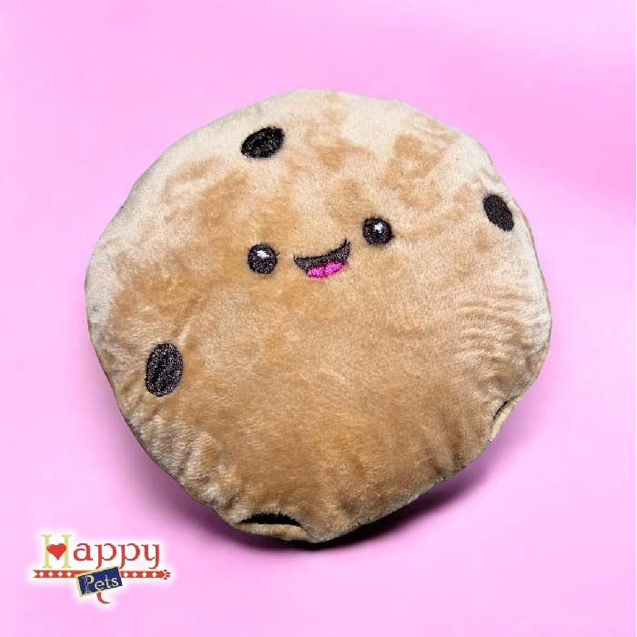 Peluche en forma de Galleta con chips de chocolate, con pito en su interior y tela doble reforzada. Apto para peludos de todos los tamaños. Material suave, resistente, liviano y fácil de lavar en lavadora.