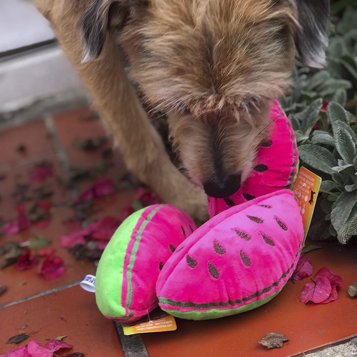 Peluche en forma de Sandia, con pito en su interior y tela doble reforzada. Apto para peludos de todos los tamaños. Material suave, resistente, liviano y fácil de lavar en lavadora.