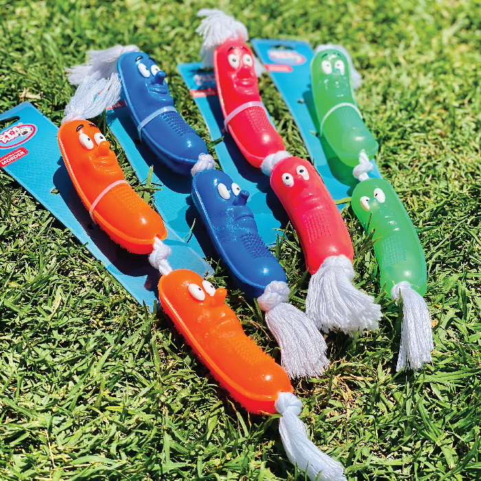 2 salchichas macizas con texturas de puitas redondeadas, unidas por medio de una cuerda gruesa con nudos en los bordes para mantenerlas unidas; para peludos juguetones y mordelones, a los que les gusta llevar cosas en su hocico y que por sus texturas ayuda también a limpiar los dientes y fortalece sus mandíbulas. Material liviano, altamente resistente, fácil de limpiar. Apto para perros medianos y grandes.