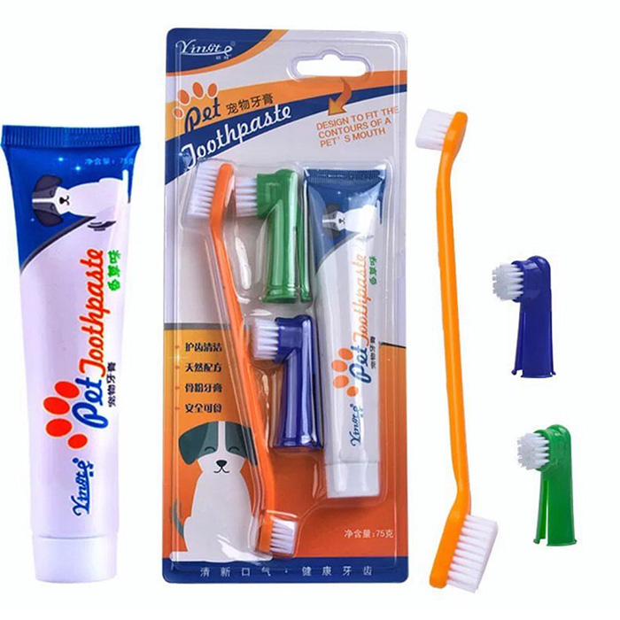 Kit de cepillos de dientes que incluye un cepillo plástico largo con doble cabeza a cada lado, uno pequeño para razas pequeñas y uno mas grande para razas grandes y dos cepillos pequeños para poner en el dedo cepillar los dientes de los mas pequeños, los mas quisquillosos que no se quedan quietos y cuando se quiere hacer un cepillado mas detallado y minucioso. Muy fáciles de usar, material resistente, liviano, fácil de higienizar. Incluye también una crema de dientes. Vienen en colores variados, sujetos a disponibilidad en la tienda.