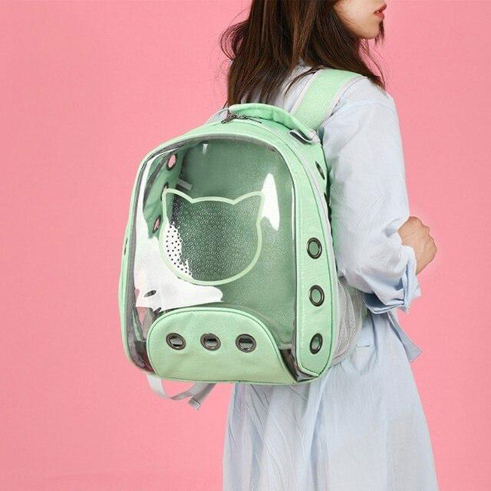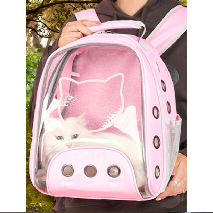 Cargador morral flexible con frente totalmente panorámico, dibujo frontal de la cara de un gatito llena de orificios para ventilación, que se puede llevar en el pecho o la espalda, zona central en material sintético impermeable con hilos brillantes, cinturón de seguridad, orificios y malla en los laterales para la ventilación, 1 bolsillo, ventana lateral con cremallera, base semirigida para mayor estabilidad y espaldar y asas acolchonadas para mayor comodidad. Ideal para gatos y perros pequeños. Soporta hasta 14 kilos. Una buena opción para viajar en moto o bicicleta.