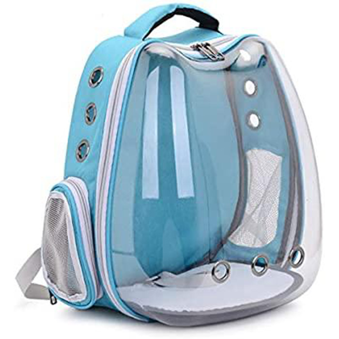 Cargador morral en forma de cara de gato, con parte frontal totalmente panorámica en Acrílico, para que puedan ir viendo el paisaje, que se puede llevar en el pecho o la espalda, zona central en material sintético impermeable, cinturón de seguridad, orificios y malla en los laterales para la ventilación, 1 bolsillo, ventana lateral con cremallera, base semirigida para mayor estabilidad y espaldar y asas acolchonadas para mayor comodidad. Ideal para gatos y perros pequeños. Soporta hasta 14 kilos. Una buena opción para viajar en moto o bicicleta.