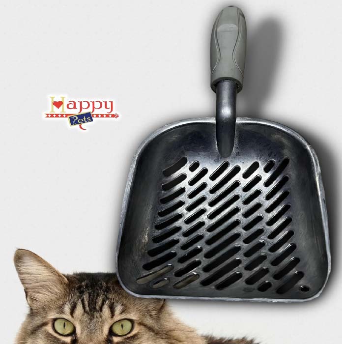 Pala grande metálica con mango en silicona, con elegante diseño minimalista y funcional, para recoger los residuos de la arenera, con orificios alargados para dejar colar la arena que aun puede seguir sirviendo y sostener las bolitas de los desechos para botarlas. Material altamente resistente, liviano y fácil de lavar.