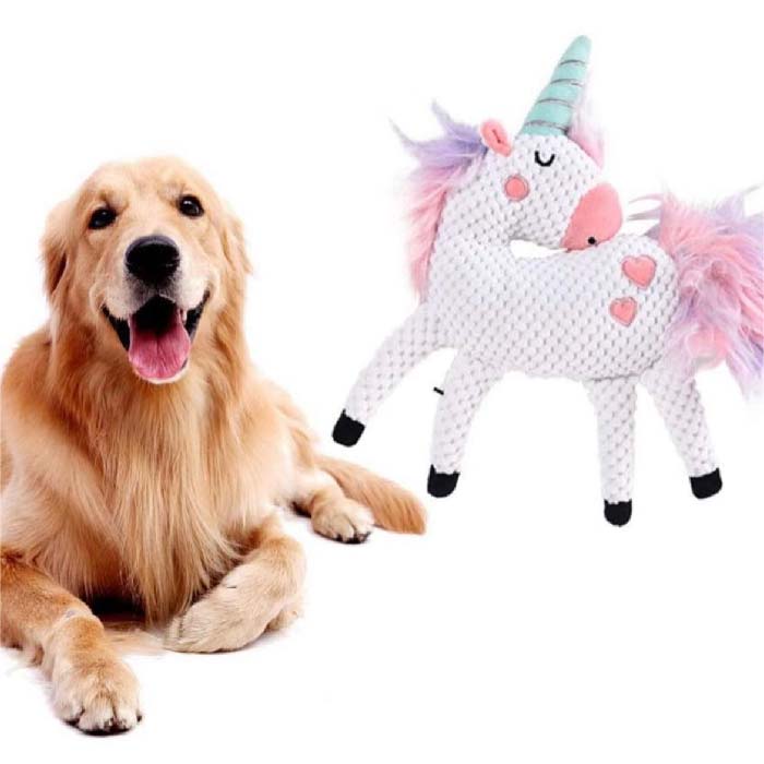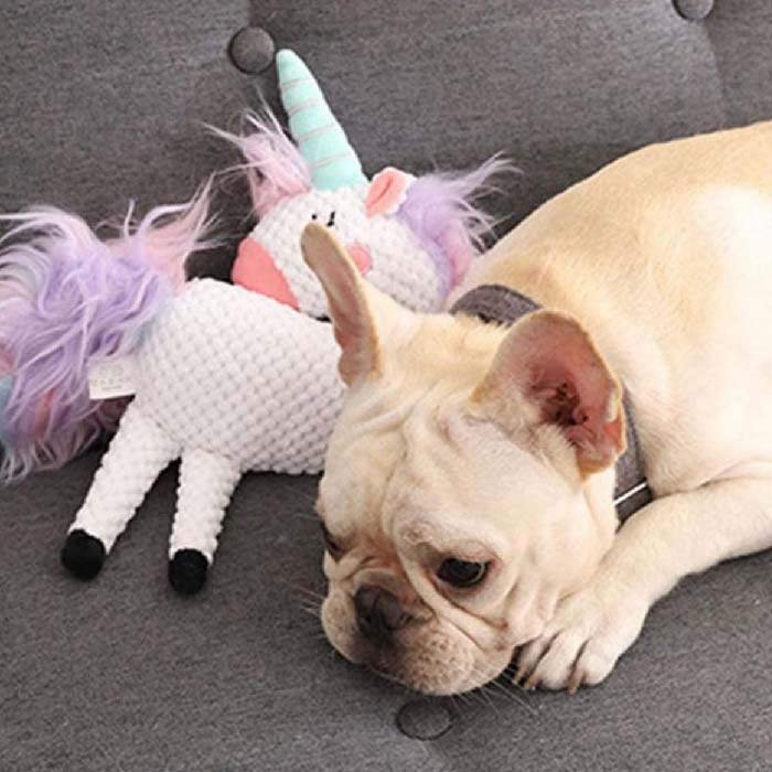 Peluche en forma de Unicornio, con pito en su interior, peluche texturado y tela doble reforzada. Apto para peludos de todos los tamaños. Material suave, resistente, liviano y fácil de lavar en lavadora.