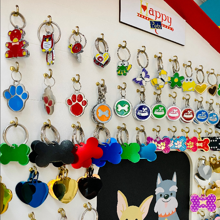 Placas metálicas en variados colores y diseños; que se graban a láser con el nombre y dos numero telefónicos.