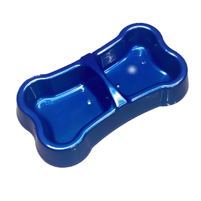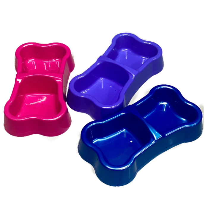 Comedero doble en forma de huesito, en material plástico resistente, fácil de lavar; apto para gatos y perros pequeños y medianos.