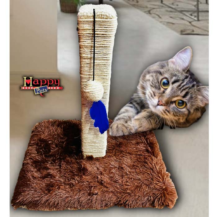 Rascador vertical, completamente forrado en Rattan, material ideal para invitar al gato a rascar y limar su garritas, manteniéndolos entretenidos y felices ya que es uno de sus pasatiempos favoritos, ayudando además a desbastar su uñas. En la parte inferior tiene una pelota con pluma para que jueguen.