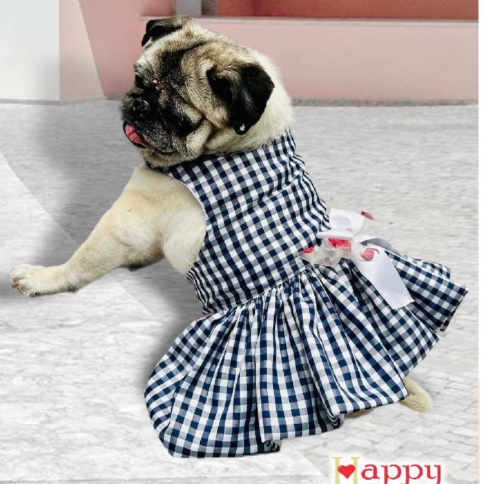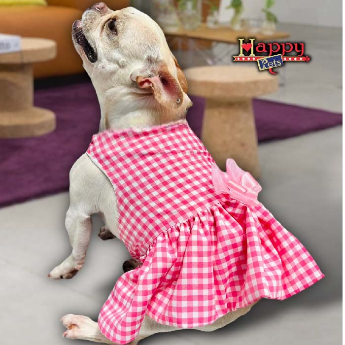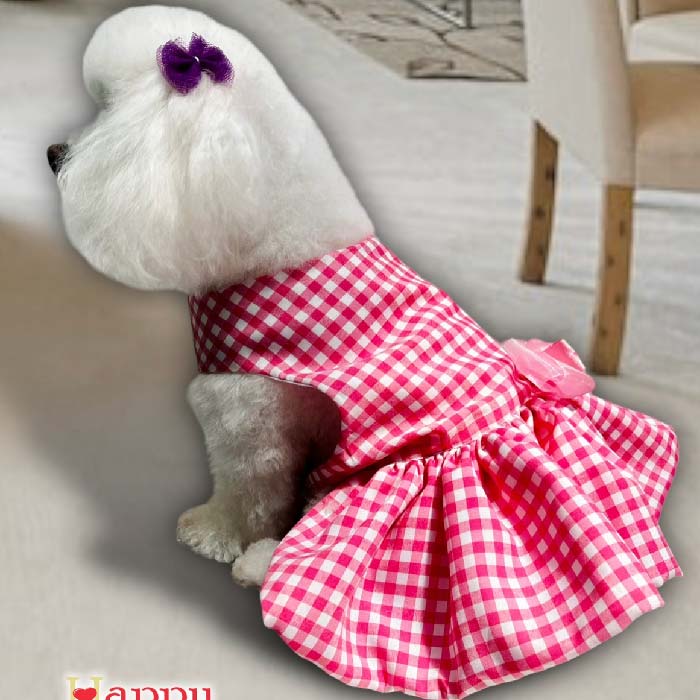 Elegante vestido de fiesta, en tela a rayas y moño grande en la espalda en color rojo con blanco; que se ajusta en el pecho por medio de 2 broches con velcro, graduables. Un conjunto de materiales, texturas y colores que harán de tu peluda el centro de todas las miradas.