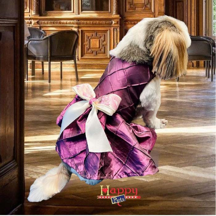 Elegante vestido de Seda, con diseño drapeado a cuadros, falda en A rotonda y moño beige con flores grande en la espalda; se ajusta en el pecho por medio de 2 broches con velcro, graduables. Un conjunto de materiales, texturas y colores que harán de tu peluda se vea como la princesa que es.